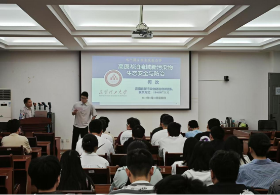 讲座中,何欢副教授结合其团队多年的研究成果,系统剖析了高原湖泊流域新型污染物的来源、迁移转化规律及其对生态系统的潜在威胁。他通过翔实的数据与典型案例,深入解读了新污染物监测技术、生态风险评估方法及防治策略的前沿进展,并分享了团队在云南省重大科研项目中取得的创新成果,包括污染物阻控技术、生态修复模式及政策管理建议。何教授强调,高原湖泊作为重要的生态屏障和水源涵养地,其健康管理需融合多学科手段,推动技术革新与政策协同,为现场师生提供了深刻的学术启示。