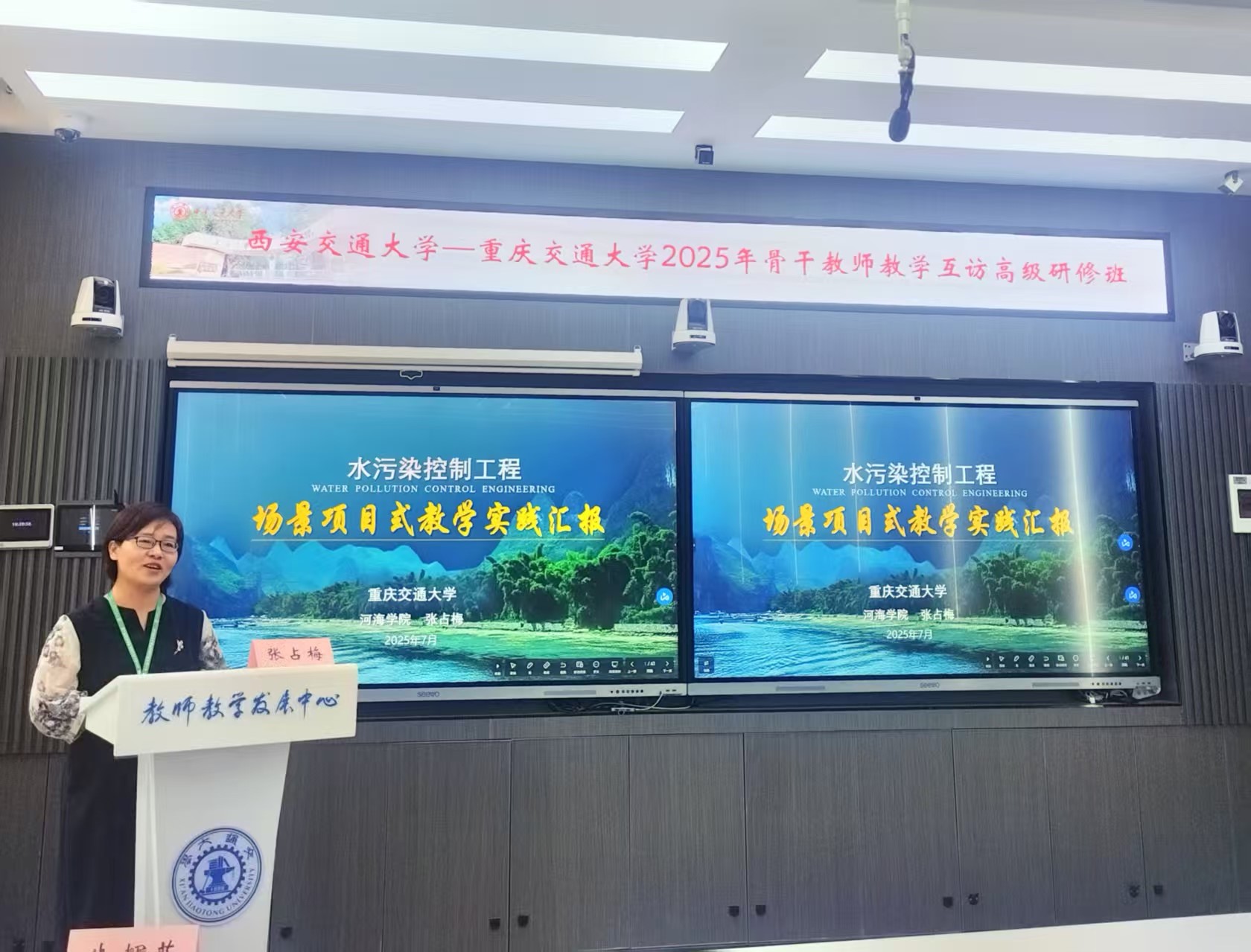 在教学示范课环节,我院教师张占梅副教授作为重庆交通大学教师代表,以《水污染控制工程》课程为例,分享了场景项目式教学的教学设计及实践成果,展示了P1→P2→P3三步进阶教学路径的实施过程,为两校教师的互访互学提供了生动鲜活的教学示范案例,赢得了参会教师的高度认可和广泛好评。