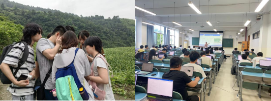 作为实习体系的“第一站”——地质认识实习,以“感知地质、启蒙专业”为目标,重点引导学生建立对地质学科的直观认知。实习内容涵盖野外地质考察、典型岩石与地层识别、西南常见地貌的成因分析、基础地质工具使用等模块。学生在专业教师带领下走进地质实习基地,亲近自然。通过实地观察褶皱、断层等地质构造;认识和分析河流、喀斯特和重力地貌成因;采集岩石标本,观察结构与成分;亲手操作地质罗盘,测量地层产状;应用地质学基础理论,初步形成“看山不是山、看水不是水”的四维地质时—空观。