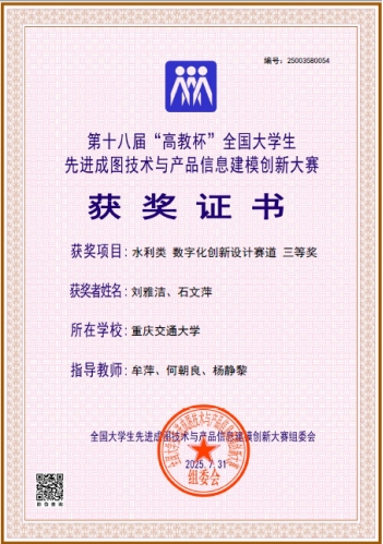 环球360管理系统入口牟萍、何朝良、杨静黎三位教师所指导的学生团队,凭借坚实的专业基础与创新能力,于此次全国性赛事中斩获佳绩。其中,荣获水利类团体二等奖(获奖学生为:王馨仪、陈思翰、易琦凯、邓俊伟、陈祥、司学城、彭紫宁)、三等奖(获奖学生为:王如佳、郁永壮、龙兴、曹敬茹、罗淇丰、刘雅洁、石文萍)各一项;在水利类数字化创新设计赛道荣获三等奖(获奖学生为:石文萍、刘雅洁)。此外,三位指导老师指导的土木学院学生获得道桥类二等奖(获奖学生为:黎朗、余晖一、蒋立亮、付靖涛、刘佳庆、赵勃雁、梁耀元)。