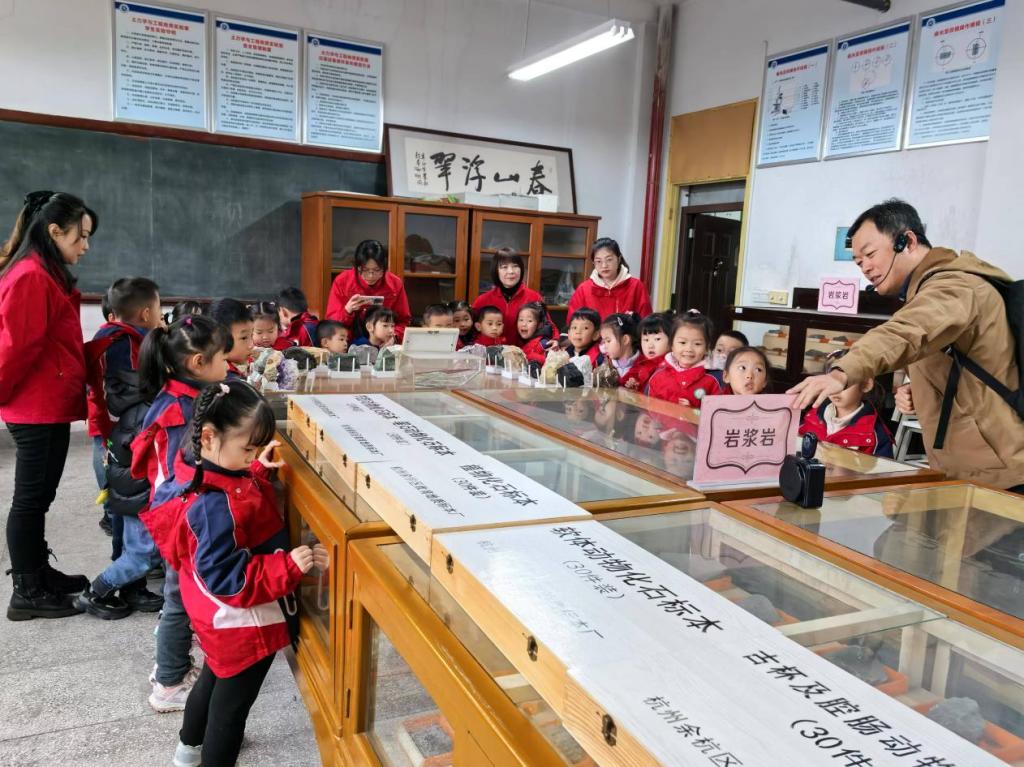 户外活动结束后,小朋友们参观了实验室的矿物、岩石标本陈列室,里面陈列着各种岩石、矿物和化石标本。小朋友们好奇地观察着这些来自地球深处的宝藏,了解到岩石有三个大类:岩浆岩、沉积岩、变质岩。李东以矿物标本为例,解释了矿物构成了岩石的概念,并用标本向孩子们解释岩石、矿物在日常生活中的用处。比如煤可以发电,自然铜可以做电线,锂云母可以做锂电池,漂亮的矿物可以做宝石等,让孩子们对矿物岩石学有了初步的了解。