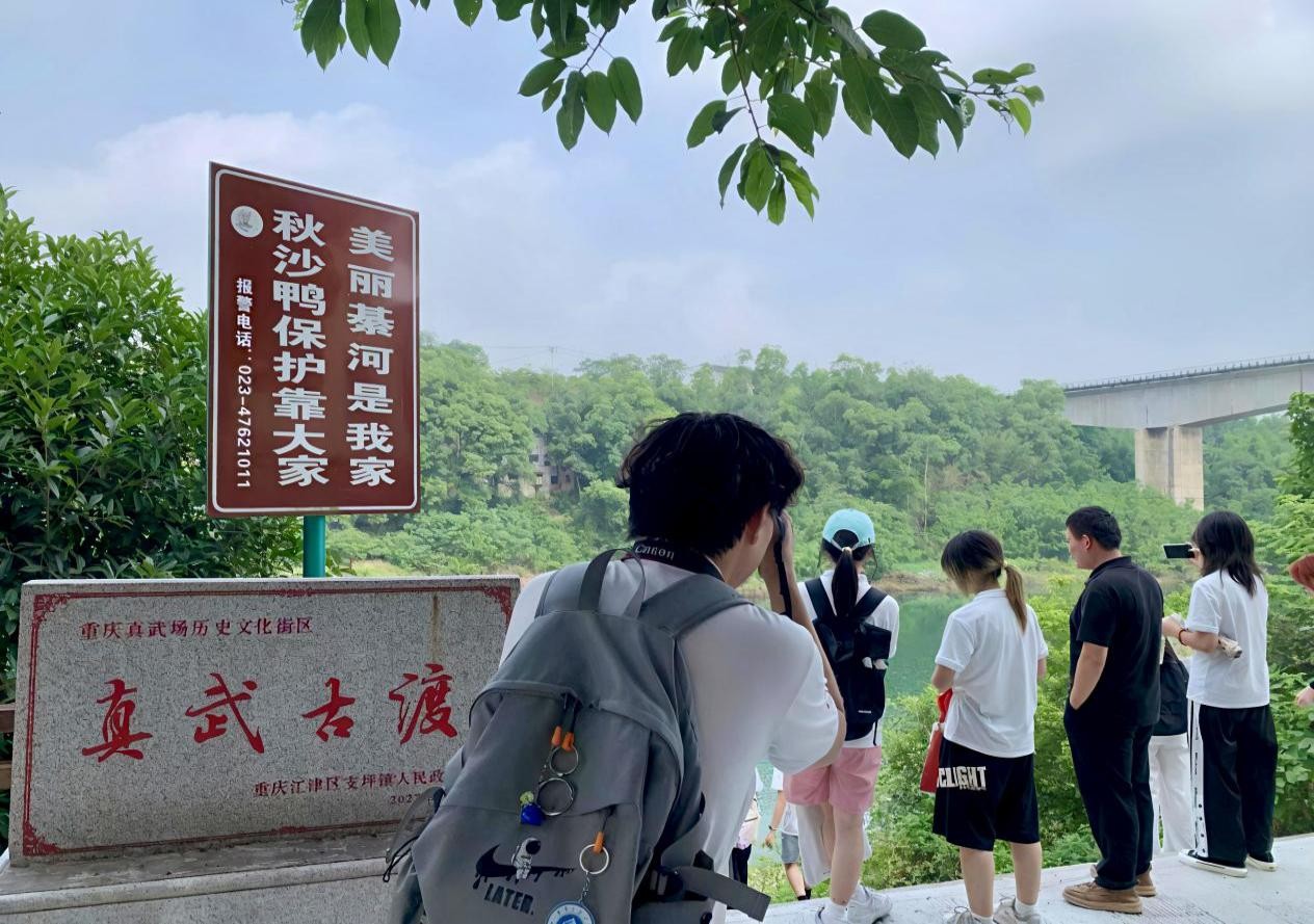 7月8日,在当地负责人的引领下,团队成员前往真武古渡渡口进行实地考察。在河岸边驻足,目睹了清澈碧绿的流水,了解了当地生态治理的显著成效。通过对水体生态系统进行细致观察,系统学习了治理具体措施,了解到:在降雨期间,由于雨水与污水的混合液通过管网溢流至江河,可能会导致某些河段出现暂时性的水质超标问题;然而,由于溢流的量相对较小且持续时间较短,若采取传统的大规模治理措施,将面临高昂的投入成本与相对有限的环境效益问题。