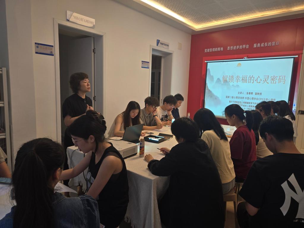 活动由学工部副部长、“交小菁”功能型党支部副书记金春寒副教授担任主训导师。她将精心设计的“幸福生态图”与“幸福能量曼陀罗”绘画环节融入其中,为参与者营造了一个沉浸式的体验空间。活动现场,金春寒引导同学们暂时放下理性思虑,执起画笔,让真挚的情感与期许在画纸上自然流淌。