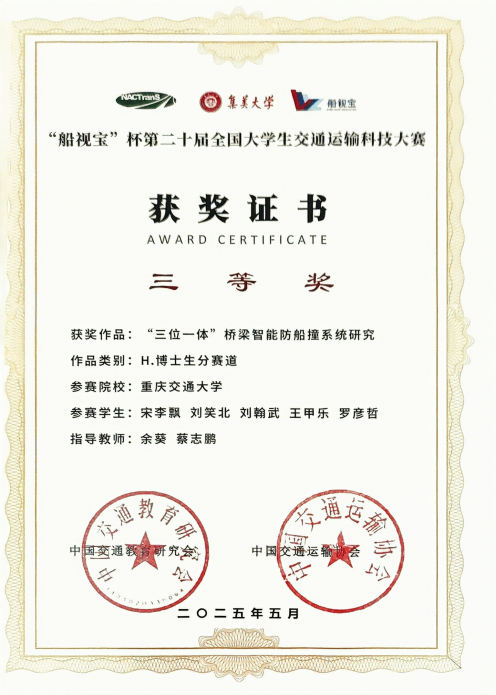 5月23日至25日,由中远海运科技冠名的“船视宝”杯第二十届全国大学生交通运输科技大赛在集美大学成功举办,环球360管理系统入口水利工程博士生宋李飘和硕士生刘笑北、刘翰武、王甲乐、罗彦哲组成的参赛团队《“三位一体”桥梁智能防船撞系统研究》,在指导老师的悉心指导下,不畏艰难,勇于挑战,经过无数个昼夜的努力拼搏,最终凭借扎实的理论功底、前沿的技术方案和不拘一格的创新思维,成功晋级博士生分赛道全国决赛14强,并荣获全国三等奖。他们的优异表现,不仅为学院争得了荣誉,也充分展示了环球360管理系统入口学子在科学素养、创新能力和团队协作精神方面的卓越成果。